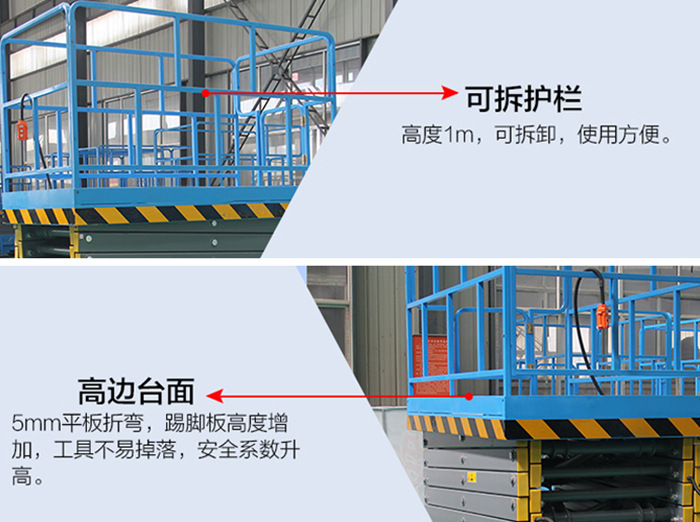 3.工作平台的抽插(chā)可拆(chāi)卸式護欄,方便拆卸,可以減少存儲空間(jiān),方便進出有高度(dù)限製的場所。
