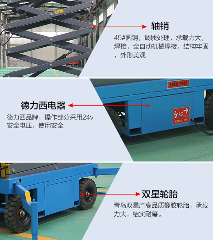10.平台和油缸活塞雙行程開關限製為(wéi)升(shēng)高限位提供雙重保障,平台到達最高點時非常平穩;