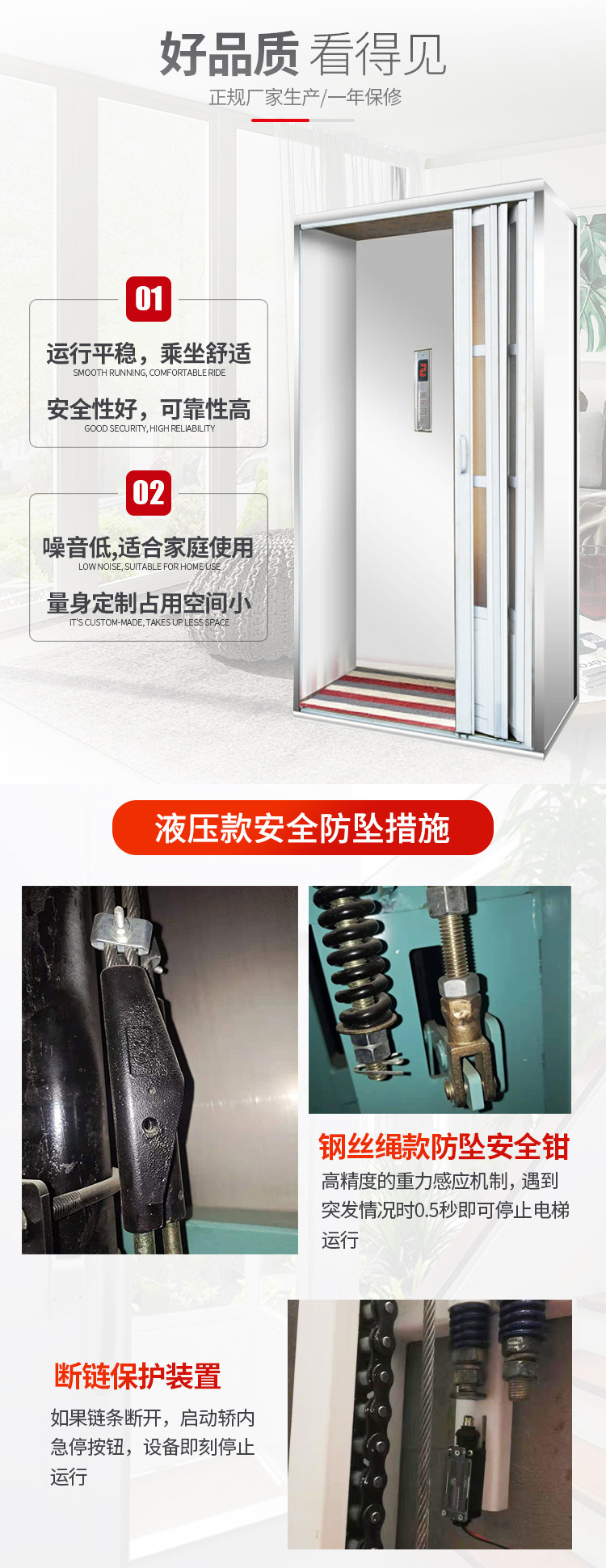 別墅(shù)升降機手拉門(及手動門)的結構類似於我們家裏常用的門(mén),有門(mén)鎖聯動(dòng)裝置和比較重。有安全裝置(zhì)係統:有停電應(yīng)急、電(diàn)磁鎖、減震器、變頻器、漏電保護器等多處為了人們使用家用電梯安全(quán)設置。升降平穩、操作簡單、優質價廉、載人載雜物均可。為人(rén)們提供了方便,節省了時間,為工作提供了效率。