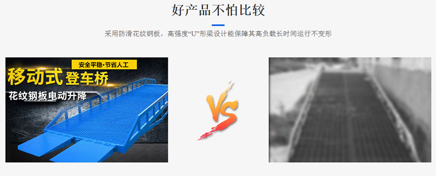 移動登車橋廣泛用於無裝卸設備的貨台及流動裝卸場所,是與叉車配合使用的(de)貨物裝(zhuāng)卸(xiè)輔助設備(bèi),可根據汽車車廂的高低調節高度、借助該設備,叉車能直接駛入汽車車廂內(nèi)部進行批量裝卸作業,隻需單人操作,不需動力電源,即可實現貨物(wù)的安(ān)全快速裝卸(xiè),即使您減(jiǎn)輕勞(láo)動強度,又能成倍提高裝卸作業(yè)效率,加快物料流通速度,獲得更大的經濟效益。